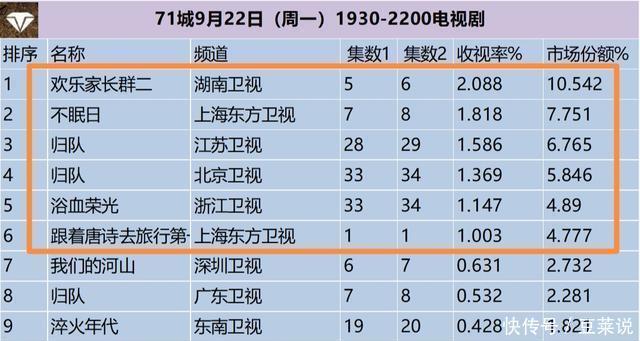 3、《归队》 收视率:1.586%,1.369% 剧情点评:看到这安心的不含粉黑大战高评分,熟悉的无流量实力派演员阵容,同时也是很久没有看过战争题材的剧了,于是果断点进来看,现在非常满意自己的决定。整部剧拍的特别好,妆造还原真实,黑黝黝的脸,大黄牙…让我们切身感受到当年抗联战士在苦寒的东北林海雪原顽强奋战反抗的艰难场景。全员演技在线,为剧集增色不少。另外,群像刻画地特别好,没有一个扁平的脸谱化角色,不管出场长短,全都有血有肉。所以在我看来,主创一定程度克制了自己的表达欲,反而专注故事本身,让我们这些观众自己去体会和感悟,这一点真的很难得。